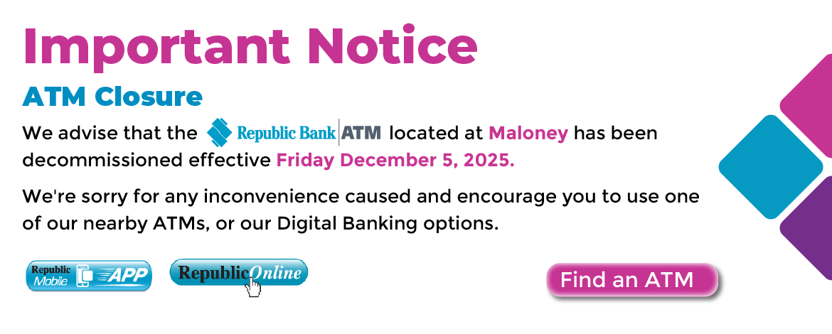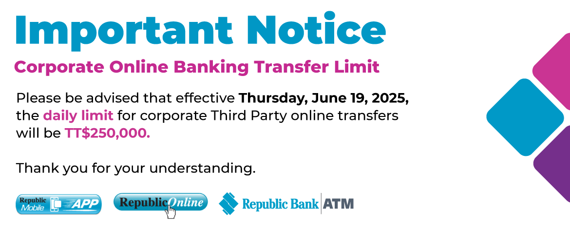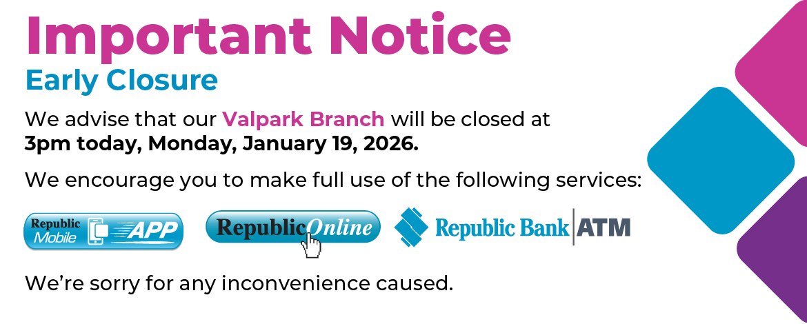 Important information concerning the investment goals, risks, charges and expenses is contained in the prospectus, copies of which are available from any branch of Republic Bank Limited or from our website and should be read carefully before investing. This investment is not insured or guaranteed by the Central Bank of Trinidad & Tobago, Republic Bank Limited, its parent company Republic Financial Holdings Limited, any affiliates or subsidiaries of the Republic Financial Group or any person or corporation. Performance is subject to variation and is likely to change over time. Past performance is not necessarily a guide to future performance. The Net Asset Value for each business day will be updated on this website before the end of each business day.