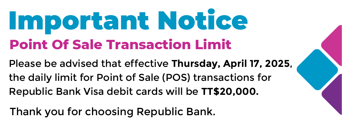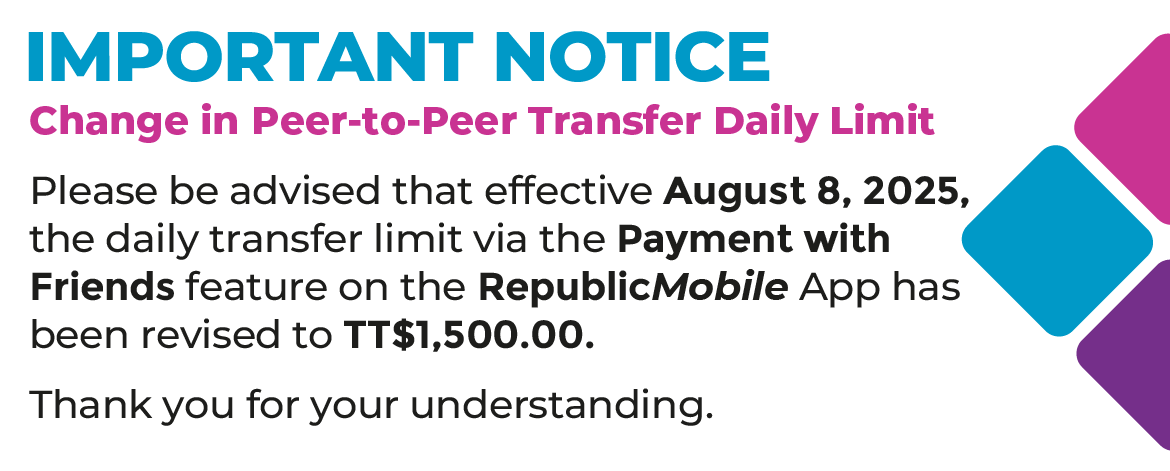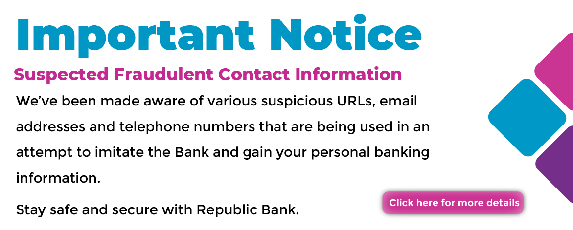 Important information concerning the investment goals, risks, charges and expenses is contained in the prospectus, copies of which are available from any branch of Republic Bank Limited or from our website and should be read carefully before investing. This investment is not insured or guaranteed by the Central Bank of Trinidad & Tobago, Republic Bank Limited, its parent company Republic Financial Holdings Limited, any affiliates or subsidiaries of the Republic Financial Group or any person or corporation. Performance is subject to variation and is likely to change over time. Past performance is not necessarily a guide to future performance. The Net Asset Value for each business day will be updated on this website before the end of each business day.