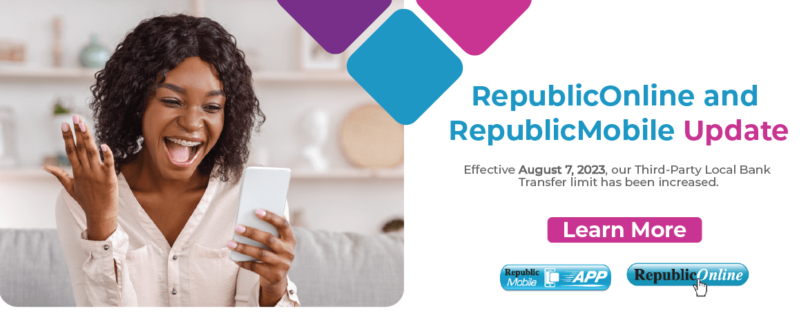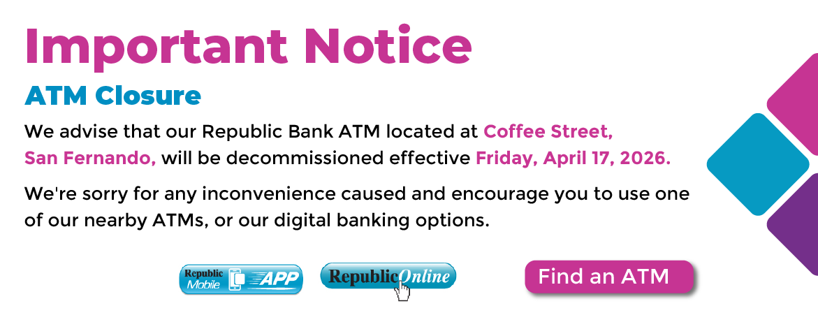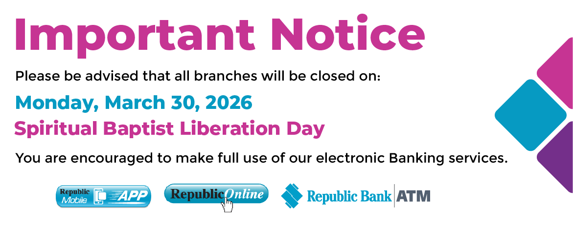 Important information concerning the investment goals, risks, charges and expenses is contained in the prospectus, copies of which are available from any branch of Republic Bank Limited or from our website and should be read carefully before investing. This investment is not insured or guaranteed by the Central Bank of Trinidad & Tobago, Republic Bank Limited, its parent company Republic Financial Holdings Limited, any affiliates or subsidiaries of the Republic Financial Group or any person or corporation. Performance is subject to variation and is likely to change over time. Past performance is not necessarily a guide to future performance. The Net Asset Value for each business day will be updated on this website before the end of each business day.