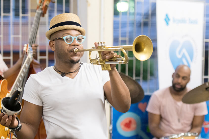 You’re the Man: Republic Bank’s Executive Director, Derwin Howell, smiles as Trinidadian-born trumpeter Etienne Charles, fully endorses the Bank’s sponsorship for his recently concluded, San Jose Suite concert. The concert was held at the Queen’s Hall on Sunday November 20. Republic Bank, co-sponsors of the event, supported Charles’ series of roving concerts which took place at The St. Dominic’s Children’s Home in Belmont, St. Mary’s Children’s Home, Tacarigua and The Princess Elizabeth Home for Special Children in Woodbook, where Charles and his band took the children down a musical journey. The concerts’ aim was to give voice to the stories of the world’s indigenous people.