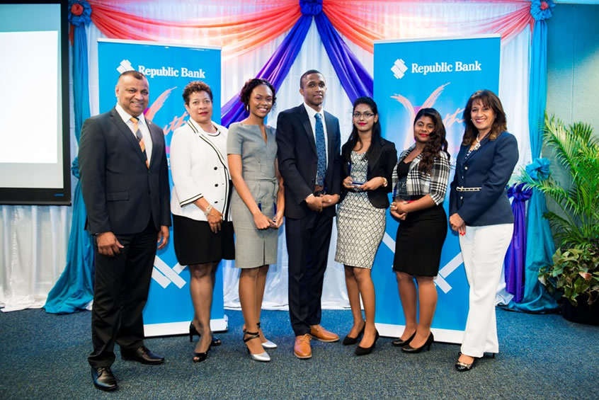 Captions:Top Performers: Maxine Mottley (3rd from left), Keegan Maikoo (centre), Amrika Phillip (3rd from right) and Samantha Singh (2nd from right) won the special awards for Most Disciplined, Most Improved, Best Business Plan and Most Outstanding, respectively, at the graduation ceremony of the 2017 Republic Bank Youth Link Apprentice Programme. They are flanked by (L to R) Executive Directors, Roopnarine Oumade Singh and Jacqueline Quamina and Group Human Resources General Manager, Anna-Maria Garcia-Brooks.