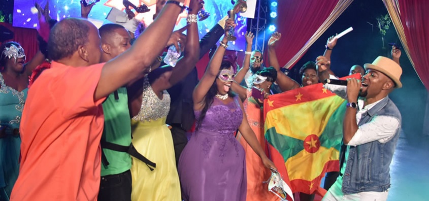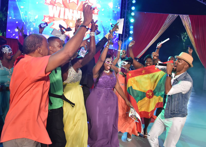 Talent Champs: Team Grenada, celebrates their win, along with host Jason “JW” Williams, at the 2017 edition of the Republic Bank Talent Spectacular competition held at O2 Park, Chaguaramas on Saturday.