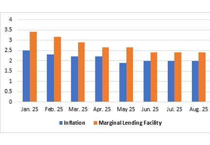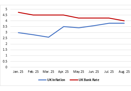 Unlike the Fed, the Bank of England (BOE) and the European Central Bank (ECB), reduced their policy rates several times during the first eight months of 2025. The ECB’s most recent decrease came in June and was preceded by three others (Figure 1). Its benchmark rates are now within the 2 – 2.4 percent range, down from 3 – 3.4 percent in December 2024. In September, the ECB held rates at the 2 – 2.4 percent range for the third consecutive month, with Eurozone inflation at the targeted 2 percent rate. The ECB also cited continued global economic uncertainty, including the yet unknown full impact of US tariffs on Eurozone GDP, among the main reasons for its decision. The BOE executed three rate reductions thus far in 2025, with the latest coming in August, taking its main interest rate to 4 percent (Figure 2) from 5 percent in December 2024. The BOE decided to cut rates in August, notwithstanding a projected rise in inflation to 4 percent in September, well above its 2 percent target. The decision was taken, considering the struggling economy and fears of further weakening of the job market. After rising to 4.7 percent in May, unemployment remained at that level in the succeeding two months. The unemployment rate was 4.4 percent at the end of 2024.