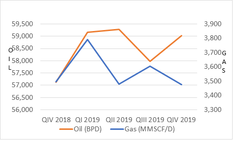 Between October and December 2019, oil production increased by 1.8 percent over the previous quarter to average 59,029.8 barrels per day (Figure 1) and was accompanied by a marginal increase in prices. The average West Texas Intermediate (WTI) oil price increased to US$56.86 per barrel from US$56.35 in the third quarter. On the other hand, Henry Hub gas prices went up by a negligible 2 cents to US$2.40 per million British thermal units (MMBTU), while gas production fell by 3.5 percent to 3.5 billion cubic feet per day (bcf/d) during the period. Beside low prices, the downstream sub-sector continues to be impeded by production challenges. During the fourth quarter of 2019, there were declines in ammonia (13.2 percent), methanol (4.5 percent) and LNG (2 percent) output. There were also declines in the barometers of exploration activity, with rig days decreasing by 6.1 percent and depth drilled down 9.6 percent.